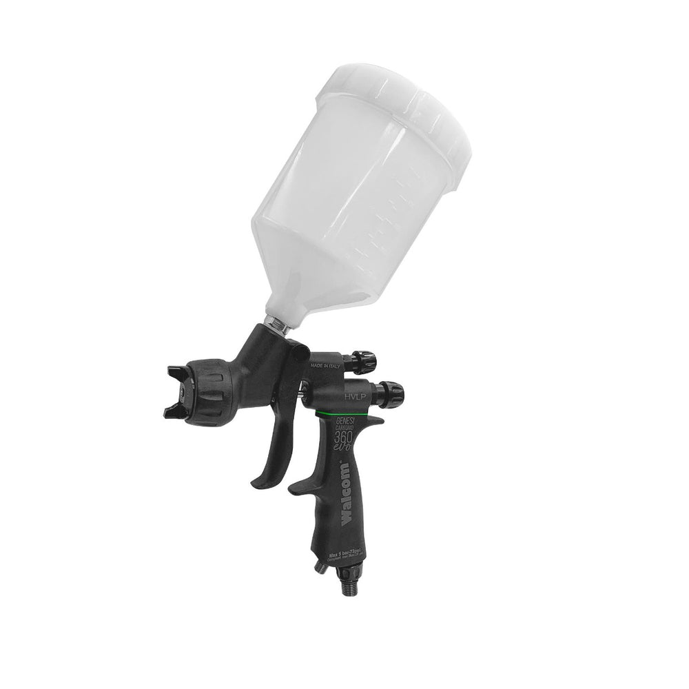 Forged aluminum spray gun body over-injected with carbon fiber allows creating a super light spray gun while maintaining the mechanical features of the metal with the premium weight/performance features of carbon fiber, a nano metric coating allows easy cleaning.